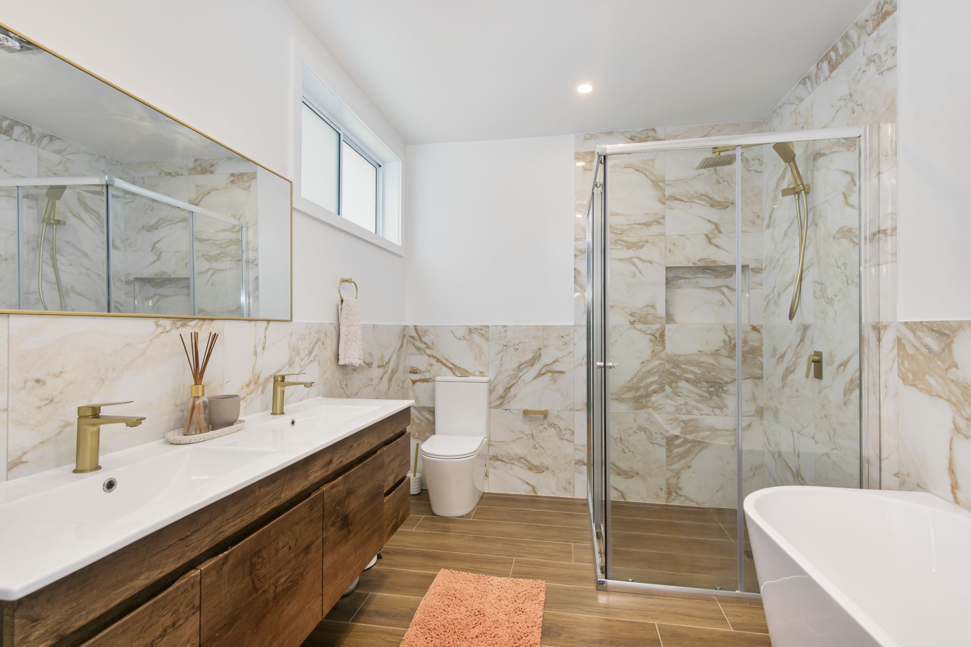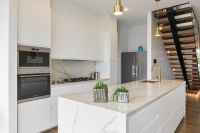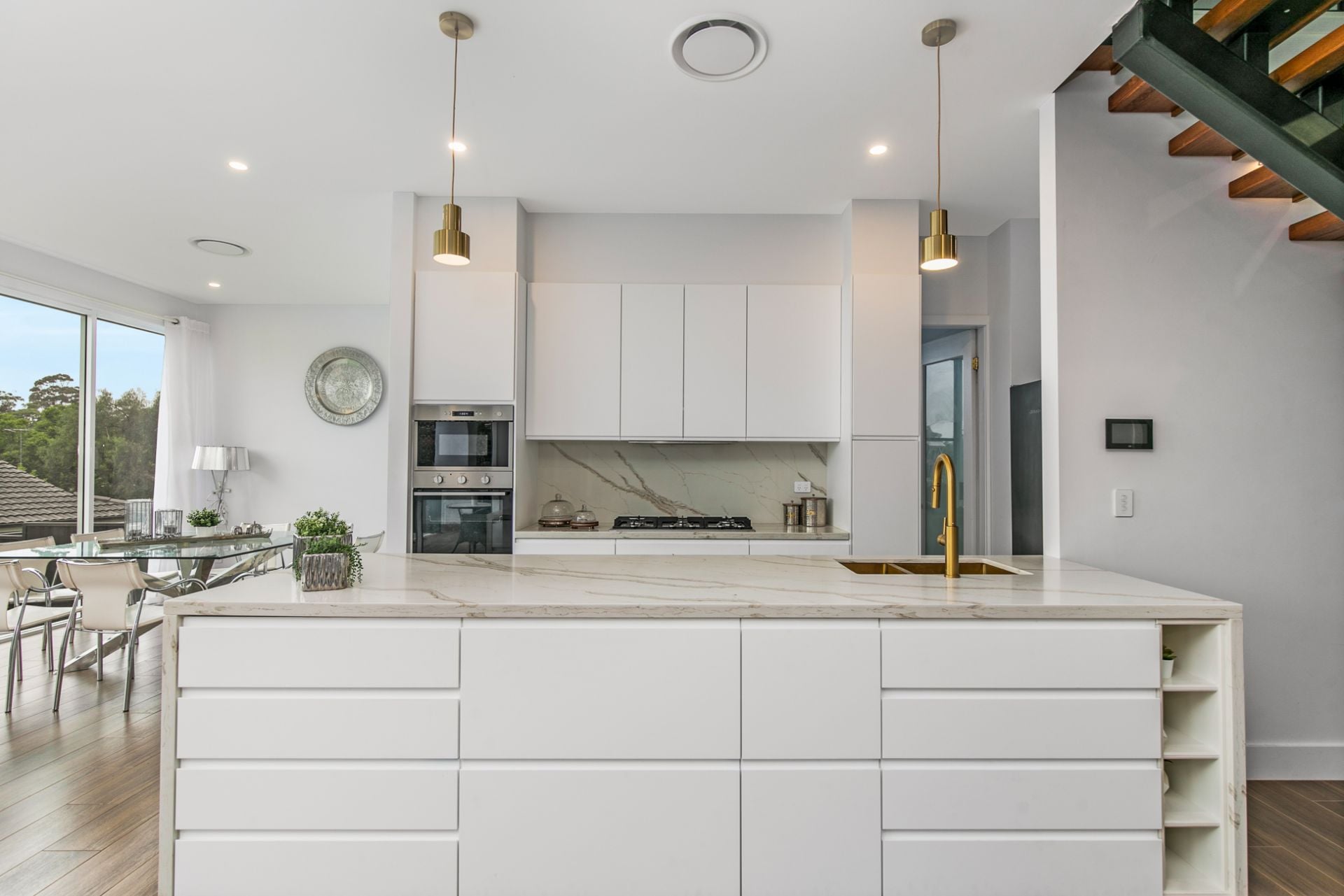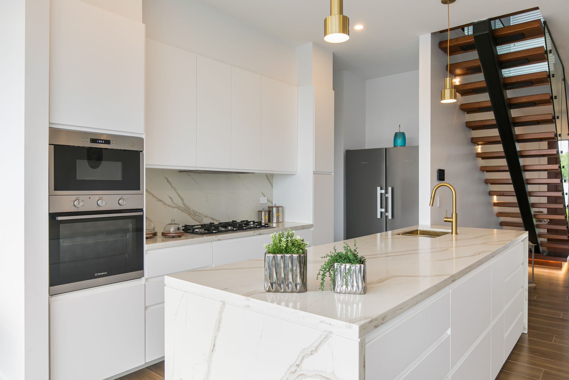 * Westinghouse appliances, inbuilt microwave, Calcutta stone, brushed gold under-mount sink