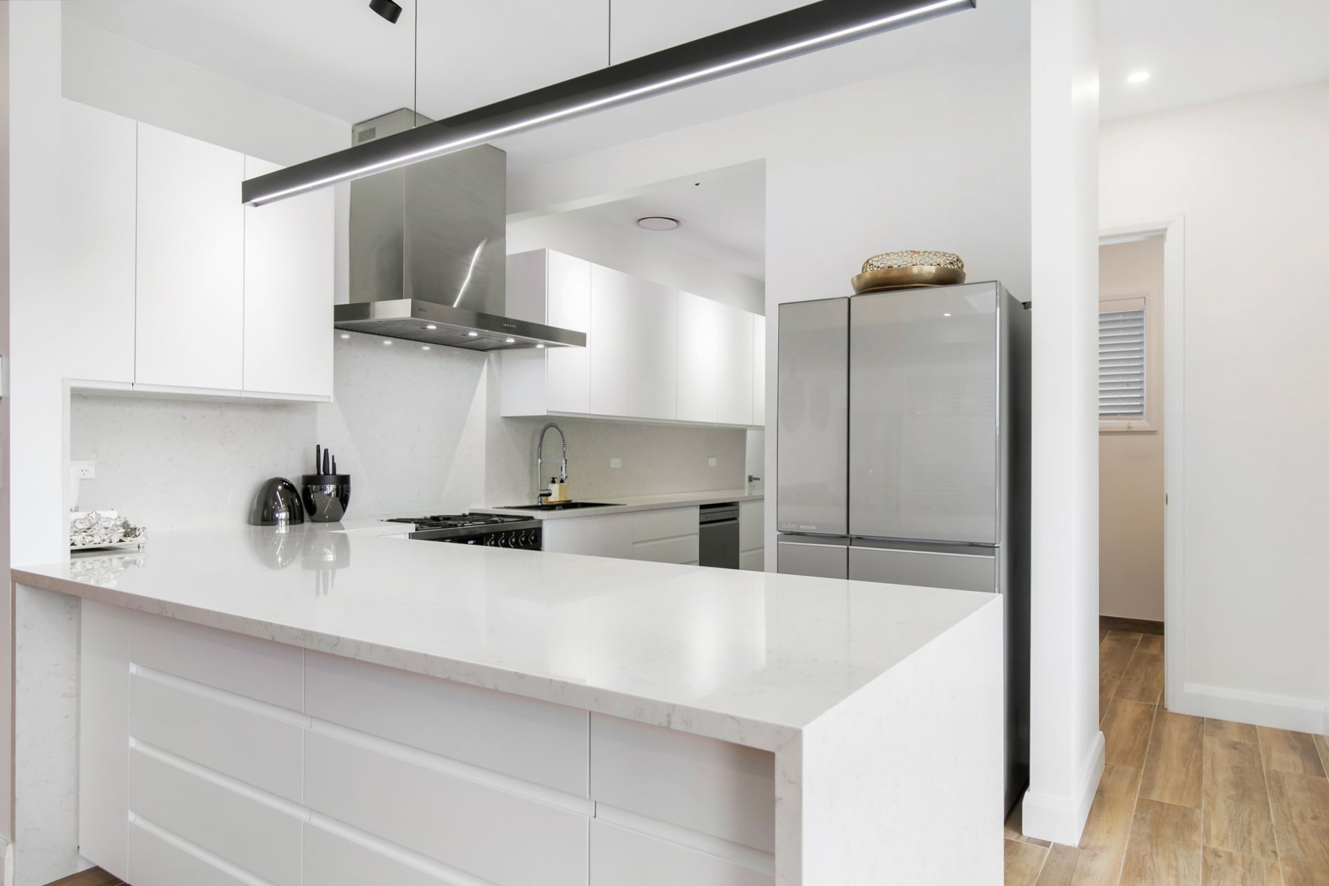* Dual storage 1,150mm width island bench, a large farmhouse style sink with Insinkerator